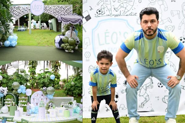Fã declarado de futebol, Léo teve o aniversário inspirado na “Léo’s League”, uma releitura infantil da Champions League, tradicional competição europeia. A decoração apostou nos tons de azul e verde, com elementos que remetiam ao universo esportivo, deixando o ambiente lúdico e personalizado para o aniversariante.
