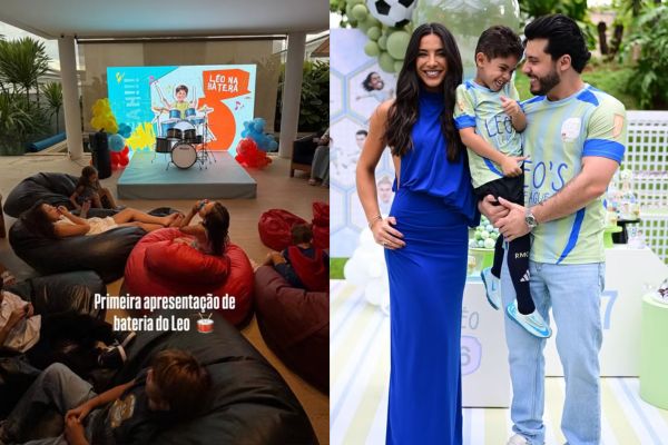 Os preparativos começaram ainda no dia anterior. Na segunda-feira (15), Murilo antecipou a celebração ao convidar os amiguinhos do filho para um momento especial: a primeira apresentação de bateria de Léo. O cantor improvisou um pequeno palco dentro de casa, incentivando o interesse musical do menino, que já demonstra afinidade com a arte, assim como os pais.