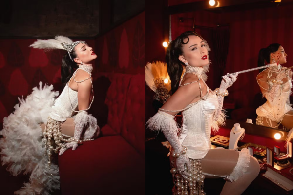 Vestida de branco, Larissa apostou em um look marcante composto por espartilho estruturado, cinta-liga, plumas volumosas, pérolas e um adereço de cabeça dramático, digno das grandes divas do burlesco clássico. A estética refinada remete aos antigos salões luxuosos, onde o Carnaval encontrava o charme do cabaré e da sensualidade sofisticada.