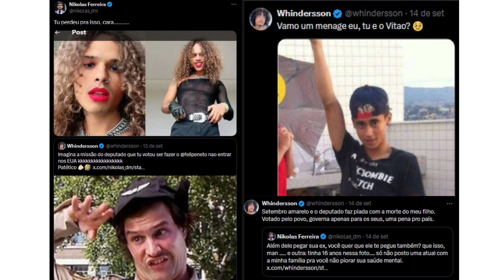 O conflito entre os dois se iniciou no sábado (13), quando Nikolas pediu aos seguidores que enviassem publicações do influenciador Felipe Neto criticando os Estados Unidos. Whindersson reagiu: “Imagina a missão do deputado que tu votou ser fazer o Felipe Neto não entrar nos EUA. Patético.”