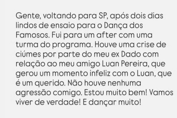 “Houve uma crise de ciúmes por parte do meu ex, Dado, com relação ao meu amigo Luan Pereira, que gerou um momento infeliz. Não houve nenhuma agressão comigo. Estou muito bem! Vamos viver de verdade e dançar muito!”, escreveu nos Stories.