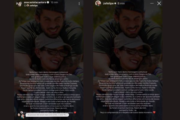 No comunicado, o filho do cantor Leonardo destacou que a decisão foi tomada de forma madura e sem conflitos. “Venho por meio desta mensagem comunicar que o meu relacionamento com a Ana chegou ao fim. Sou grato por tudo o que vivemos juntos. Aprendi muito com ela. Fez eu enxergar outro Zé Felipe que existia em mim, coisas que eu não fazia há muito tempo”, iniciou.