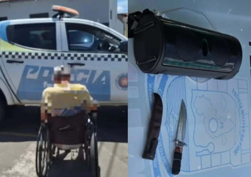 Durante a abordagem, os agentes identificaram que ele estaria ameaçando moradores e teria utilizado uma faca. O objeto e uma caixa de som foram apreendidos.