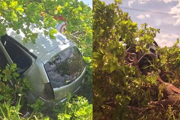 Um carro ficou pendurado em uma árvore depois que a motorista passou mal e perdeu o controle do veículo na manhã desta sexta-feira (7), no km 111 da BR-343, na localidade Santa Rosa, em Piracuruca, Norte do Piauí. Segundo a Polícia Militar, quatro pessoas ficaram feridas, entre elas uma mulher e três crianças.