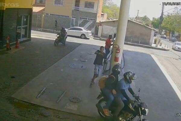 No vídeo, o suspeito atravessa a rua ao lado do posto e se aproxima do motociclista, que estava parado com uma passageira. O assaltante aponta a arma para a cabeça da vítima, que não reage, entrega o veículo e sai correndo.