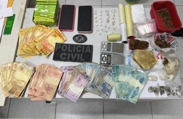 Durante o cumprimento do mandado de busca, os policiais apreenderam porções de crack, maconha e cocaína, além de materiais usados para embalar as drogas, dinheiro em espécie e um veículo.