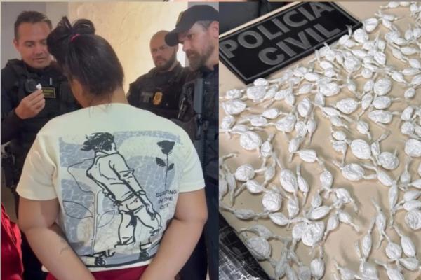 No imóvel, os policiais apreenderam porções de cocaína prontas para venda, dois tabletes do entorpecente, balança de precisão e documentos. Após o flagrante, “Aninha” foi autuada por tráfico de drogas e encaminhada à delegacia para os procedimentos legais.