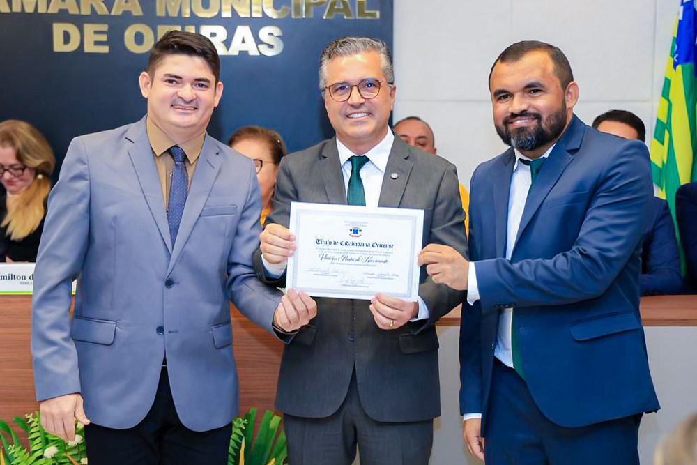 O deputado estadual Dr. Vinicius (PT) foi homenageado com o Título de Cidadão Oeirense, entregue nesta quinta-feira (2), em reconhecimento aos serviços prestados e à atuação em favor do desenvolvimento de Oeiras. A honraria foi concedida por meio de proposição do vereador Evando Gonçalves.