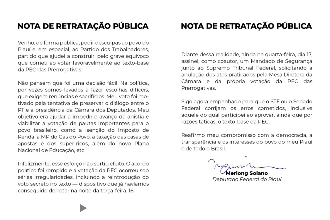 O deputado federal Merlong Solano (PT) divulgou nesta sexta-feira (19), por meio de suas redes sociais, uma nota pública em que se desculpa pelo voto favorável à Proposta de Emenda à Constituição (PEC) que restringe as investigações de senadores e deputados, conhecida como PEC da Blindagem. Na mensagem, o parlamentar direciona suas desculpas aos piauienses e ao Partido dos Trabalhadores, classificando seu voto como um “grave equívoco”.