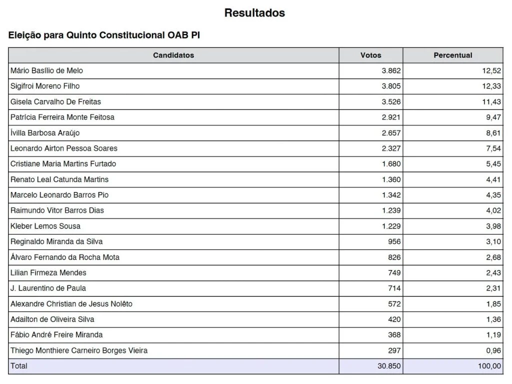 Na próxima fase, os nomes escolhidos passarão pela análise do Conselho Seccional da OAB-PI, que definirá a lista sêxtupla após sabatina realizada pela Comissão Eleitoral do Quinto Constitucional.