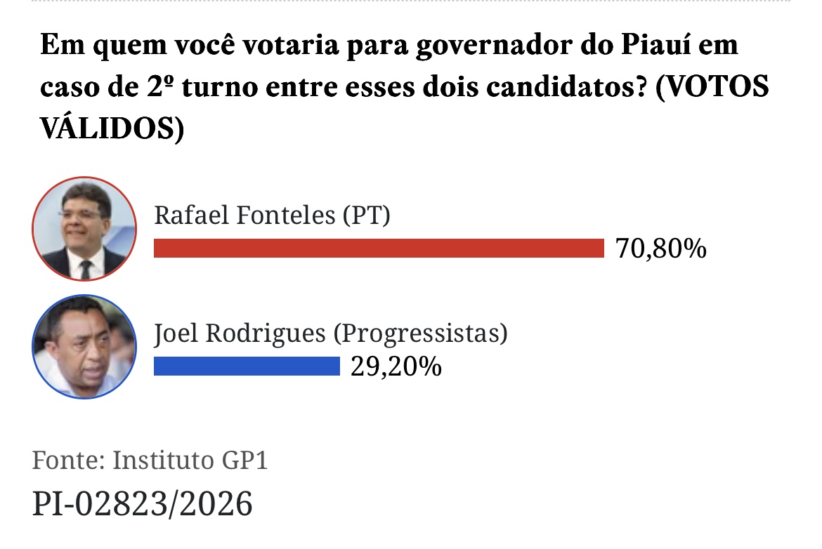Uma pesquisa divulgada nesta segunda-feira (13) aponta os números de um possível segundo turno para o Governo do Piauí. No cenário estimulado, o governador Rafael Fonteles aparece com 59,7% das intenções de voto, enquanto Joel Rodrigues soma 24,6%.